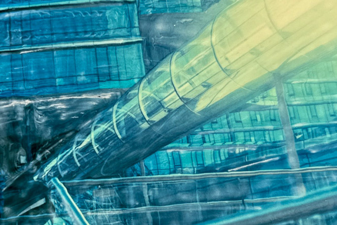 Die Serie Nord/LB entstand vor über 20 Jahren auf Polaroid, bei der die weiche Bildschicht direkt nach der Belichtung gezielt manipuliert wurde. Mit Werkzeugen wird die Emulsion verschoben, gezogen oder strukturiert. Die Technik verbindet fotografische Aufnahme mit handwerklicher Eingriffskraft und schafft eine malerische Bildoberfläche.