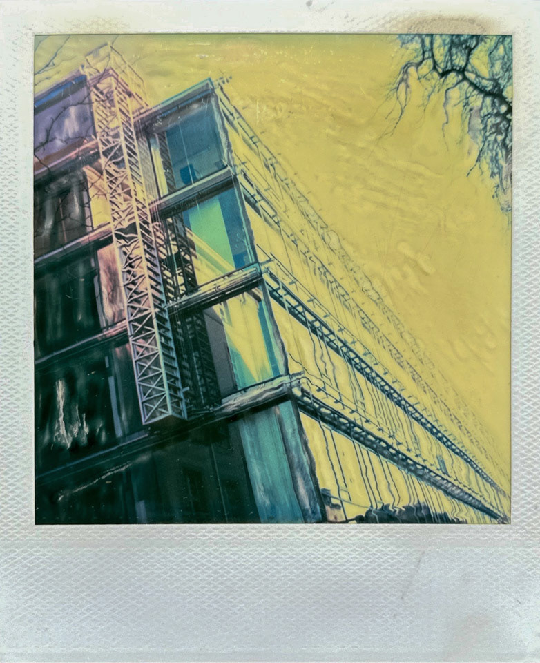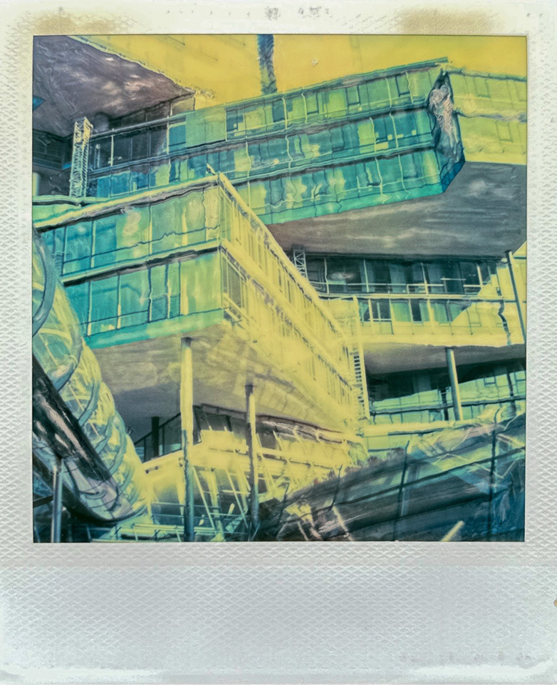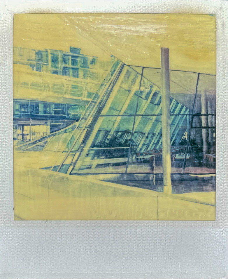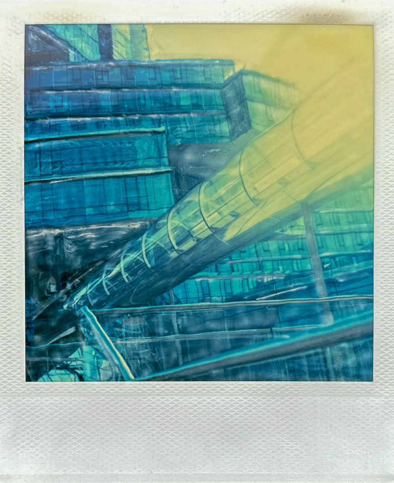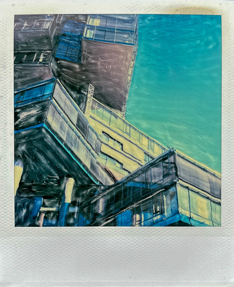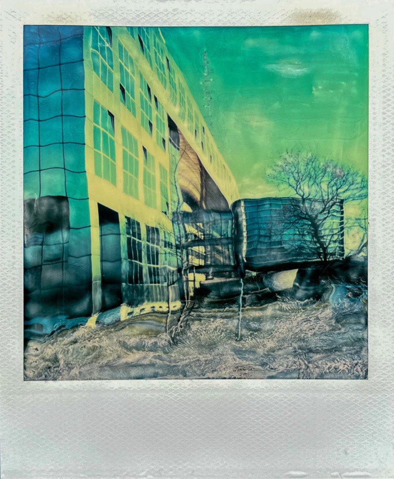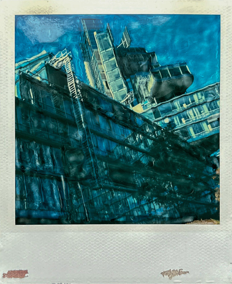 Die Serie Nord/LB entstand vor über 20 Jahren auf Polaroid, bei der die weiche Bildschicht direkt nach der Belichtung gezielt manipuliert wurde. Mit Werkzeugen wird die Emulsion verschoben, gezogen oder strukturiert. Die Technik verbindet fotografische Aufnahme mit handwerklicher Eingriffskraft und schafft eine malerische Bildoberfläche.