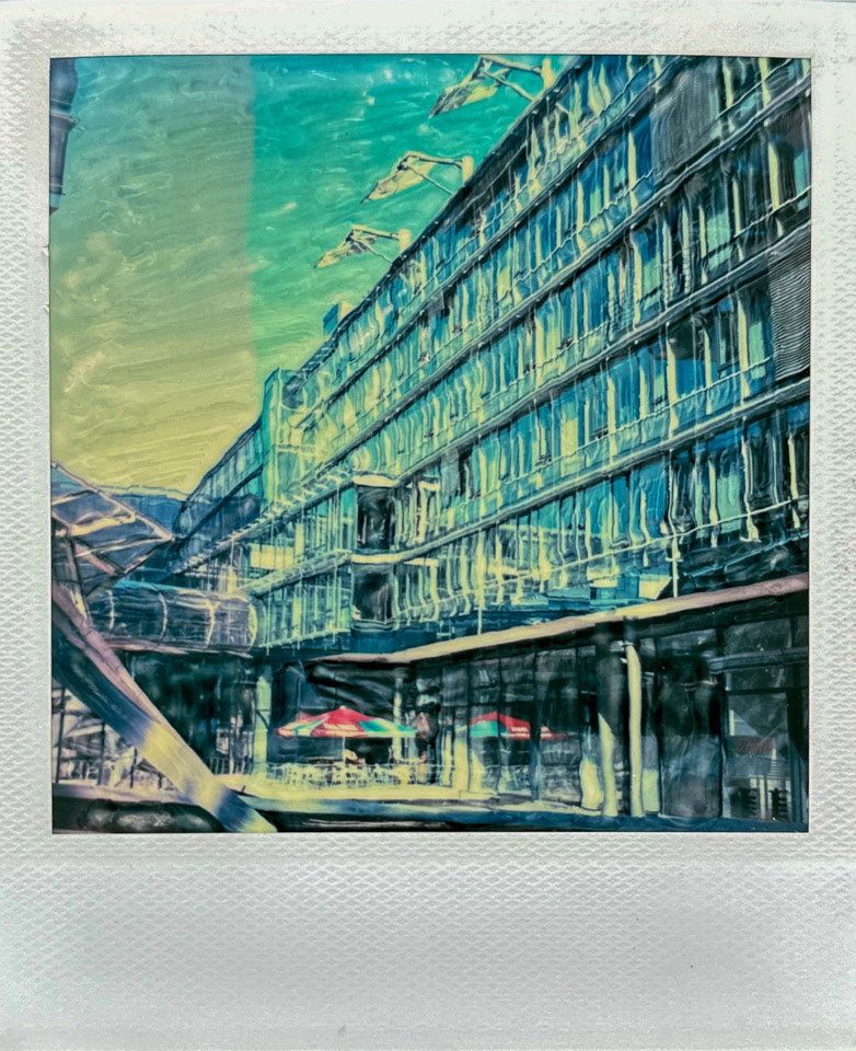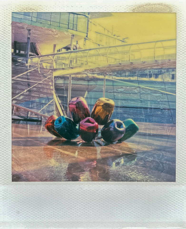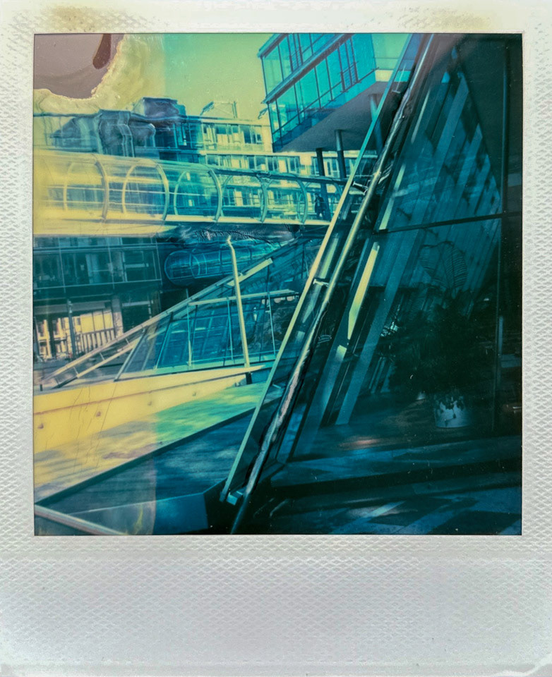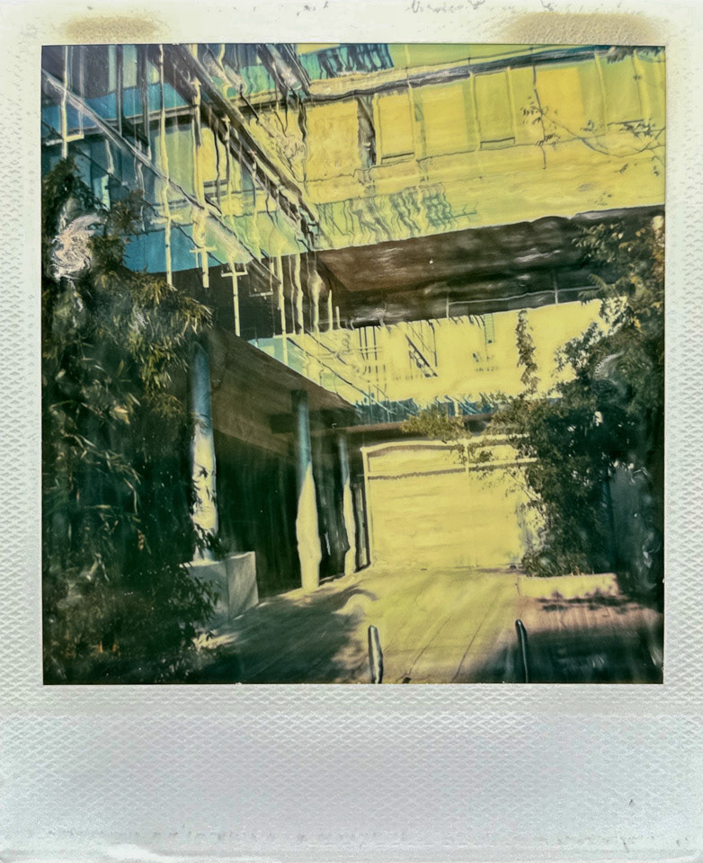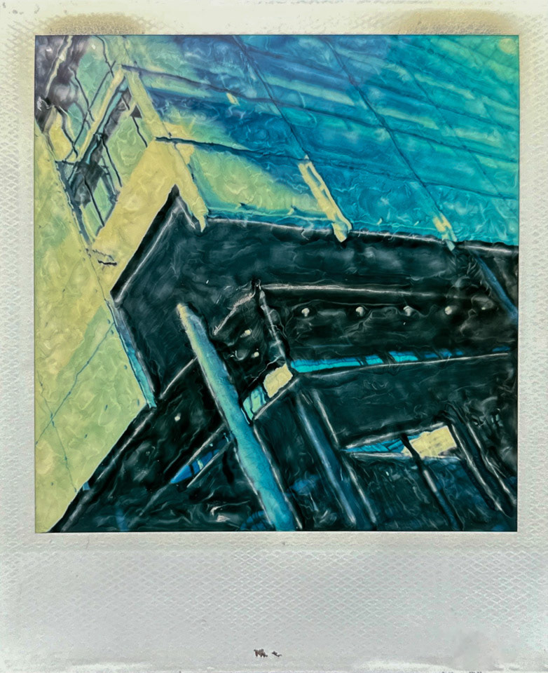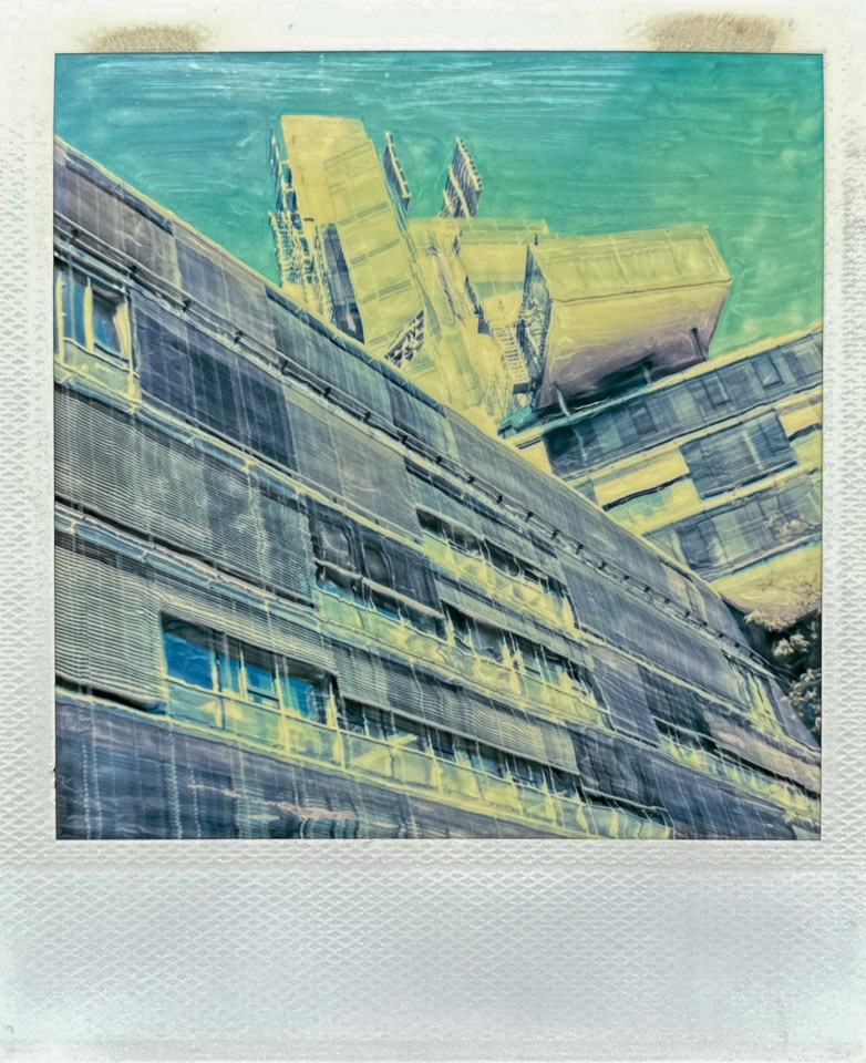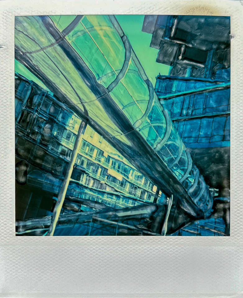 Die Serie Nord/LB entstand vor über 20 Jahren auf Polaroid, bei der die weiche Bildschicht direkt nach der Belichtung gezielt manipuliert wurde. Mit Werkzeugen wird die Emulsion verschoben, gezogen oder strukturiert. Die Technik verbindet fotografische Aufnahme mit handwerklicher Eingriffskraft und schafft eine malerische Bildoberfläche.
